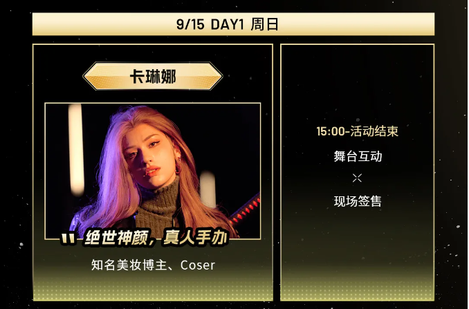 9月15日15:00开始,卡琳娜将在杭州CJMF·不止音乐节的次元舞台开启营业模式,与所有来到现场的小伙伴进行互动,据说会随机掉落无差别饭撒,在音乐节现场人人都能拥有的那种!打招呼、飞吻甚至更多……互动会一直持续到签售结束。但是都会有哪些具体互动内容,现在就不告诉你,嘿嘿~现场还提供自定义互动机会,个人面对面互动、集邮属于付费项目,购买内场票进入内场拿号排队就可以拥有!