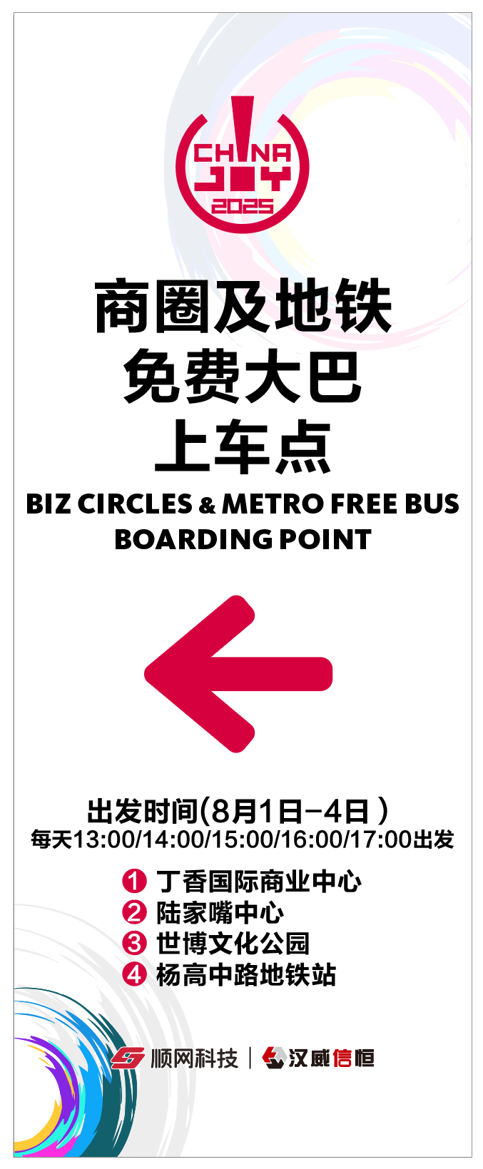为切实解决观众散场后的返程瓶颈,主办方在上海新国际博览中心与丁香国际商业中心、陆家嘴中心L+MALL、上海罗丹艺术中心之间在本届ChinaJoy开展期间将开设专门的短驳车,方便大家前去商圈感受不同的联动体验;同时增设由展会现场前往阳高中路地铁站的便捷接驳,高效纾解了各地观众在尽兴观展后的交通难题,提供了便捷舒心的返程选择,深度联动展览效应与城市消费场景,把ChinaJoy的超高人气转化为刺激市区经济活力的“催化剂”,让ChinaJoy展会热力真正赋能整个城市的消费脉动。与浦东核心商圈携手点燃次元盛夏狂欢,一次前所未有的次元盛宴即将震撼来袭!