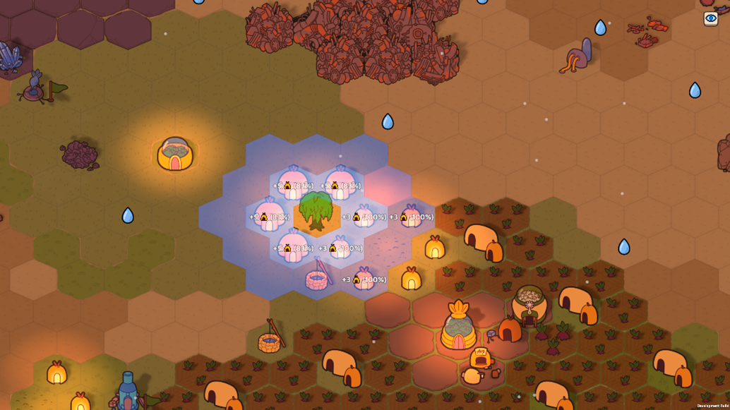 我一直想让游戏呈现出一种略带冥想色彩的“心流”体验:玩家可以静下心来建造农场、种植作物,偶尔驱赶威胁定居点的机器人。但在只有占位音乐、几乎没有音效的阶段,总感觉少了什么。Tobi加入之后,他那轻柔、空灵又温暖的音乐配合Sproutlings浇水、修剪植物时的实际音效,整个游戏体验提升了一大截。