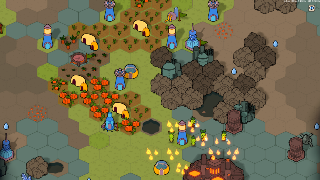 后来,我觉得玩法还不够丰富,于是为Sproutlings加入了更多模拟经营的维度,比如住房、幸福感和食物管理。我也想在危险的环境之外,加入一种与植物生长截然相反的威胁。于是,机器人作为潜在的危险来源就这样诞生了。